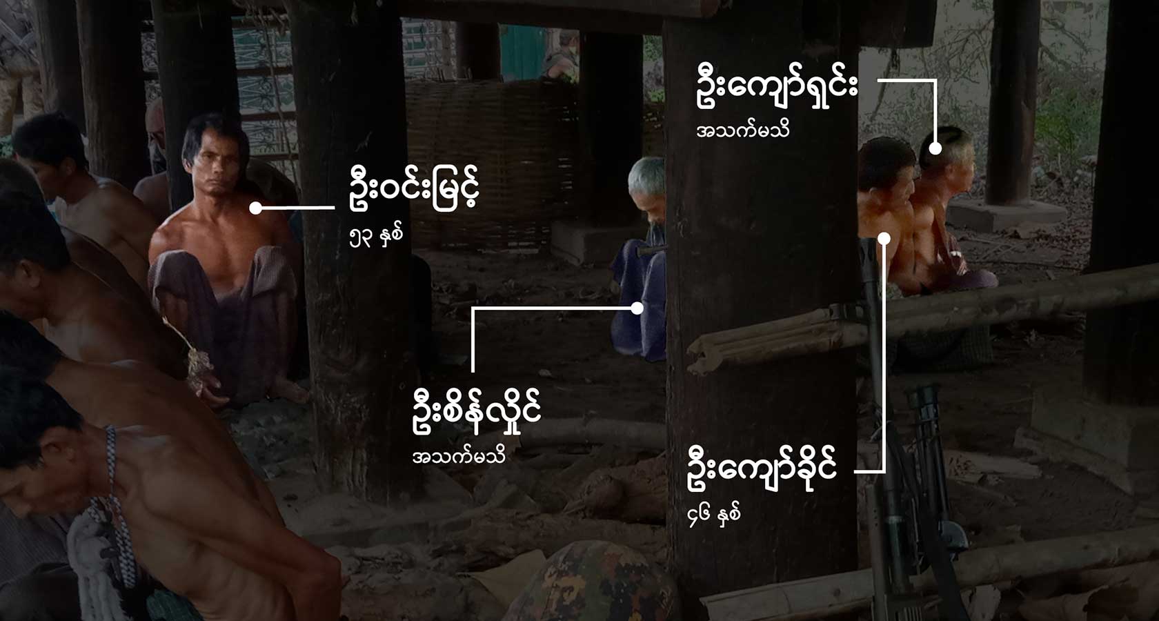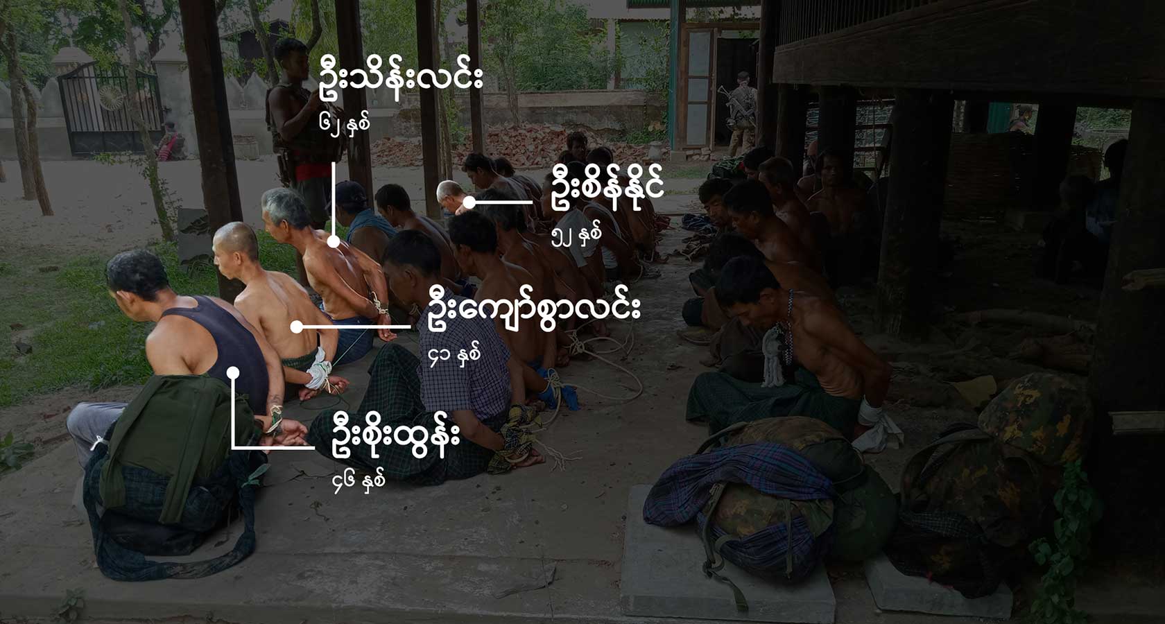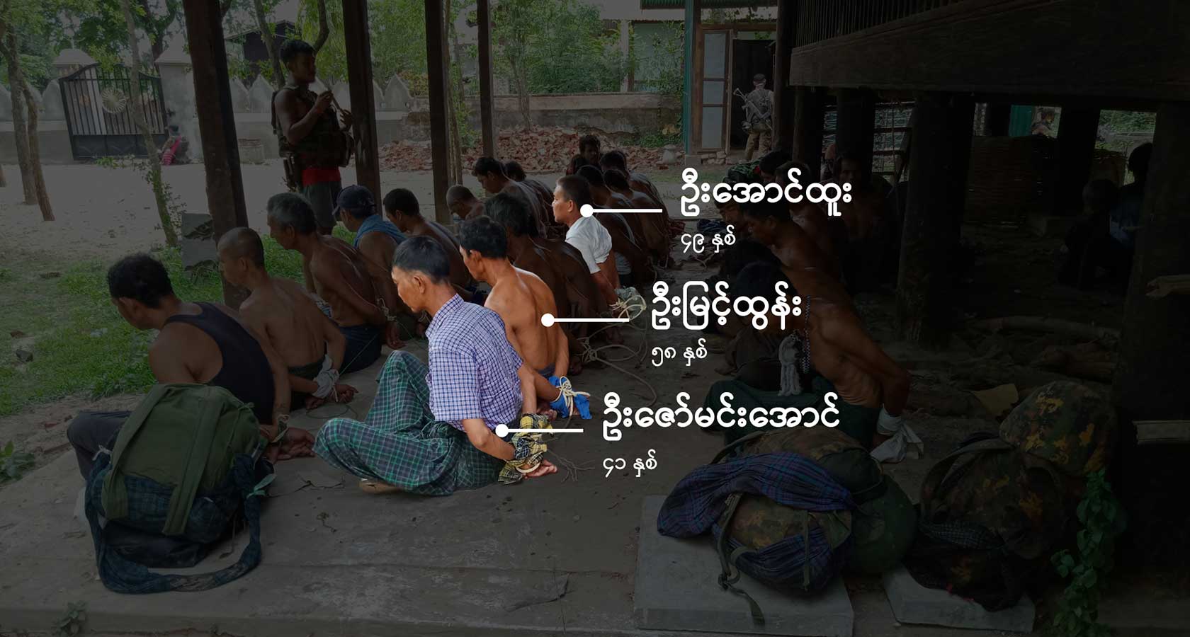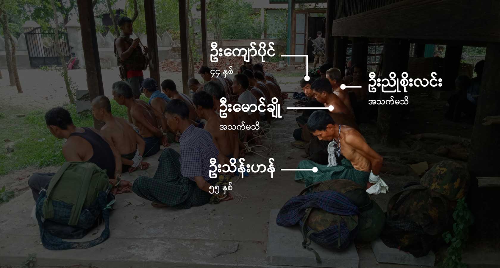 မုန်တိုင်ပင်ဘုန်းကြီးကျောင်းအတွင်း လက်နောက်ပြန်ကြိုးတုပ်ထားသည့် ရွာသားအယောက်သုံးဆယ်ခန့်အား တန်းစီထိုင်ခိုင်းထားသော ဓာတ်ပုံများကို စစ်ကောင်စီတပ်သား ကျကျန်ခဲ့သည့် ဖုန်းမှတစ်ဆင့် RFA က ရရှိခဲ့ပါသည်။ ကာယကံရှင်များ၏ မိသားစုများမှတစ်ဆင့် ရွာသား ၁၅ ယောက်ကို (ပုံတွင်နာမည်များဖြင့် ဖော်ပြထားသည်) မည်သူမည်ဝါဖြစ်ကြောင်း RFA က စုံစမ်းဖော်ထုတ် အတည်ပြုထားပါသည်။